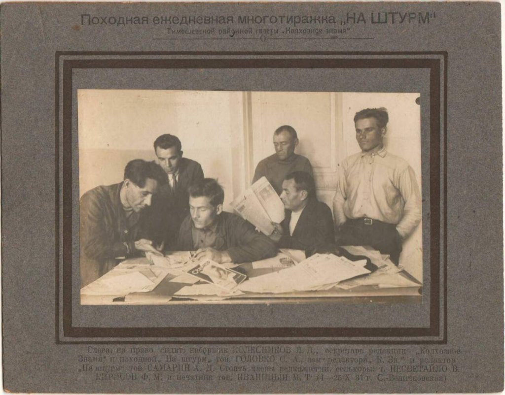ПЛАНОВ — ГРОМАДЬЕ. С первого же номера, 21 октября 1930 года, «Колхозное знамя» провозгласила: «Выпуск райгазеты — успех строительства социализма и укрепление его позиций. Превратим нашу газету в массовый политический орган. Селькоры и читатели, на помощь газете». Какая эпоха — такие и лозунги. Редакция газеты сразу определила задачи того времени: «Успешно выполнять и перевыполнять годовой план хлебозаготовок, провести второй колхозный большевистский сев, мобилизовать средства населения (ЕСХН, самообложение, заем и друг.); коллективизировать бедняцко-середняцкие хозяйства единоличников, выполнить план всеобуча и т. д.». Под руководством районного комитета ВКП(б) газета пообещала «развернуть массовую работу, чтобы помочь партийно-советским организациям сплотить бедняцко-середняцкие массы, колхозников и единоличников и двинуть их на все участки хозполиткампаний. Бороться как с «левыми» троцкистскими загибами, так и с правым уклоном, как главной опасностью, этой агентурой кулачества в рядах партии, с бюрократизмом, волокитой, развивая критику и самокритику. Беспощадно бороться с кулачеством до полной его ликвидации». Но чтобы намеченное выполнялось, необходимо было активное участие «станичных и сельских партийно-советских организаций, селькоровской и читательской массы в присылке писем и в распространении газеты».