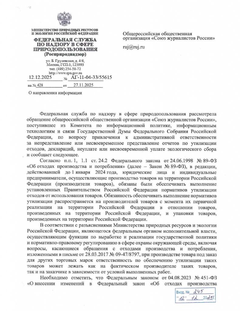 После сентябрьского форума в Сочи Союз журналистов России направлял запрос в Росприроднадзор об уплате экологического сбора редакциями печатных СМИ.