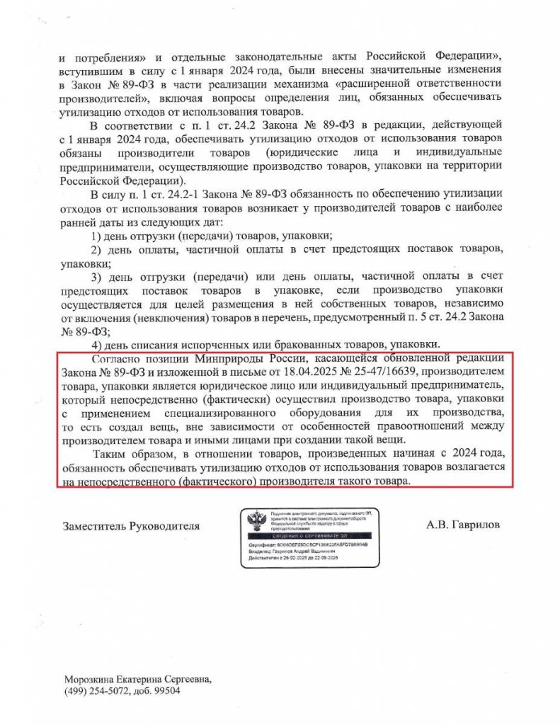 В ответе за подписью заместителя руководителя ведомства А.Гаврилова приводится позиция Минприроды России: в отношении товаров, произведенных, начиная с 2024 года, обеспечивать утилизацию отходов должен фактический производитель товара: тот, кто непосредственно (фактически) осуществил производство товара, упаковки с применением специализированного оборудования для их производства, то есть создал вещь, вне зависимости от особенностей правоотношений между производителем товара и иными лицами при создании такой вещи.